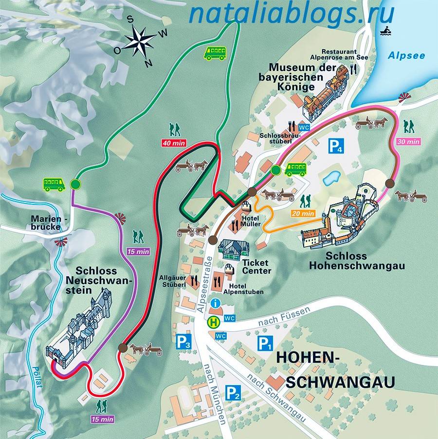 По этому же билету Вы сможете проехать в автобусе № 78 от железно-дорожного вокзала до замка Хоэншвангау. Ниже предлагаем карту с расположением наиболее важных объектов в районе замков Хоэншвангау и Нойшванштайн — парковки, остановка, центр продажи билетов …