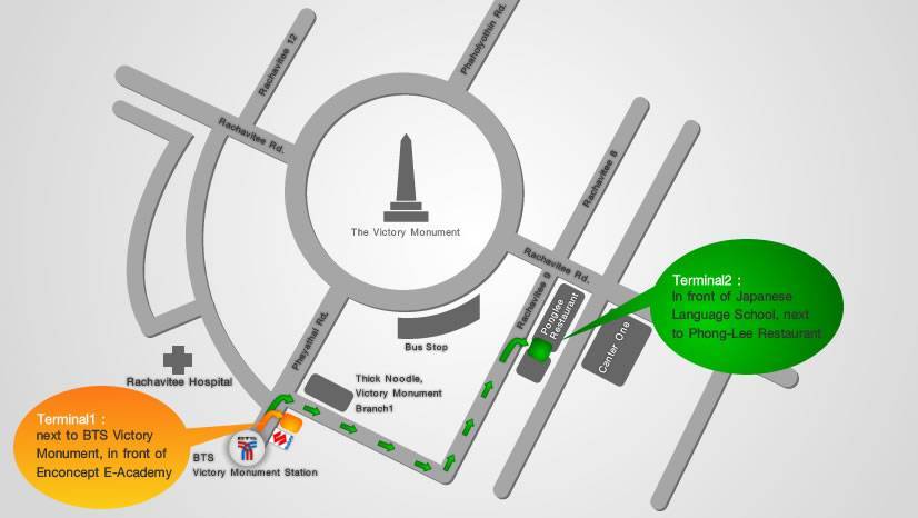 C октября 2016 года отсюда больше не ходят минивэны в другие города Таиланда. Военная хунта боролась с пробками на площади, которые возникали из-за деятельности 4 000 микроавтобусов, создавшими по сути нелегальный автовокзал посреди города. Минивэны распределеили между тремя главными бас-терминалами Бангкока и от Victory Monument сейчас ходят бесплатные шаттлы до этих трех автовокзалов. Если вам ближе к монументу, чем к вокзалам — приезжайте сюда. Шаттлы ходят с 4:30 утра и до 20:30 каждые 20 минут.