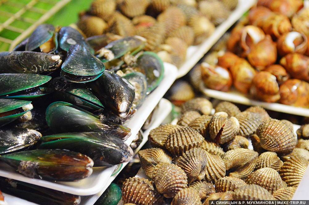 Морепродукты на рынке представлены в изобилии. Кальмары на гриле, креветки во фритюре, вареные крабы с острым соусом. Вам с удовольствием упакуют крабов с собой, но лучше их есть горяченькими.