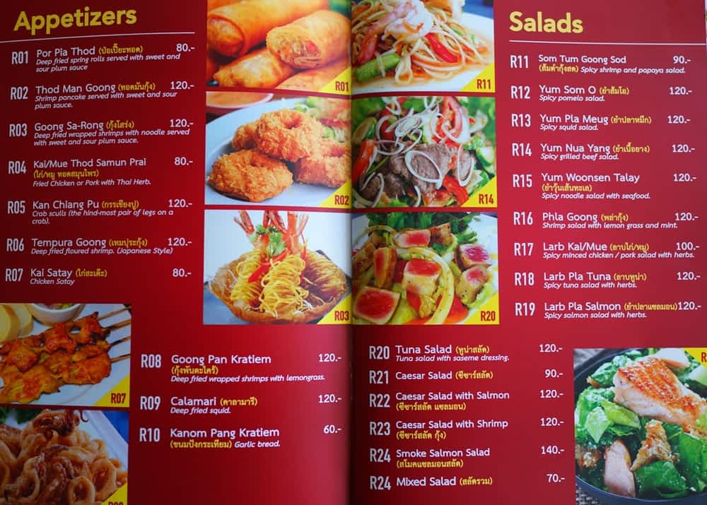 У всех аппетиты разные, поэтому средний чек определить сложно. Одни туристы довольствуются обычными креветками в кляре, другие предпочитают баловать себя дорогими лобстерами, третьи вполне могут насытиться простыми уличными деликатесами из передвижных тележек. Меню обеда и ужина практически идентично. Однако днем не стоит рассчитывать на какие-то особенные морские деликатесы. Как правило, рыба и дары моря доставляются в ресторан к вечернему наплывы посетителей. Сытный обед обойдется примерно в 200 батов на человека.