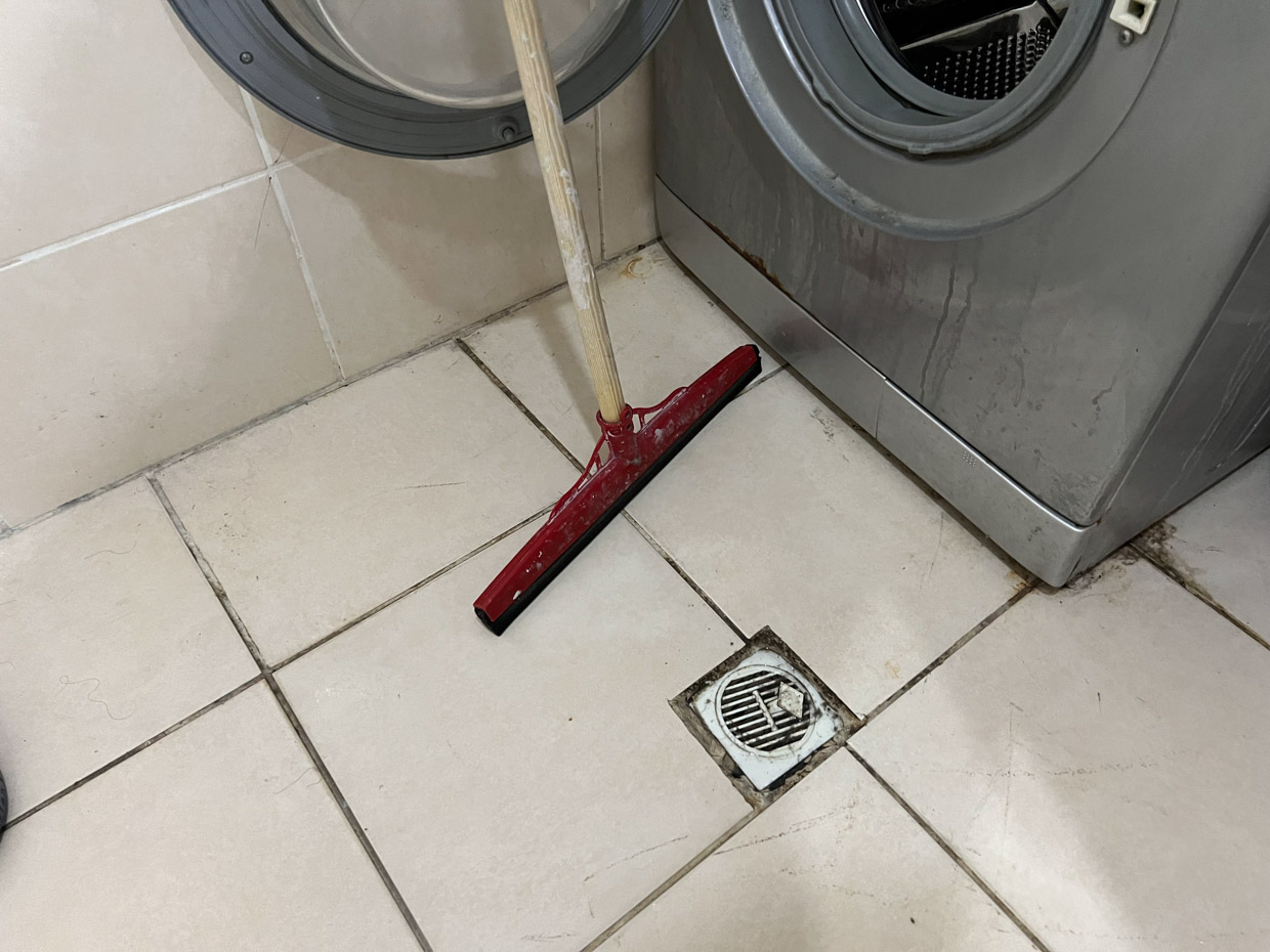 Из раковины всё время течёт вода, убирать её нужно специальной шваброй прямо в водосток.