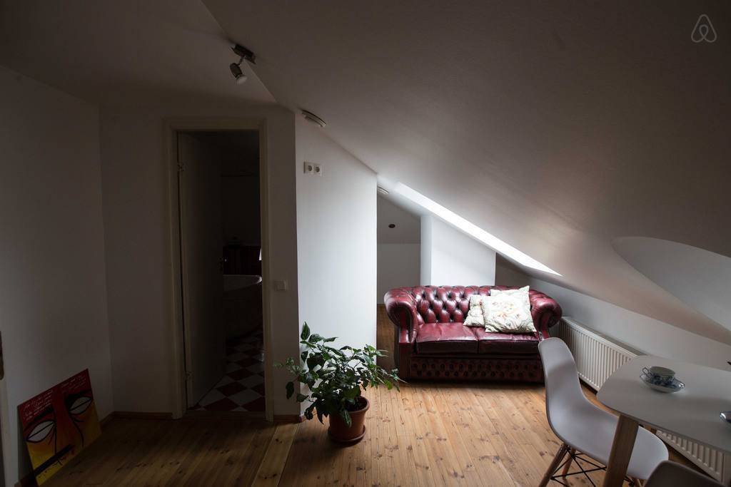 м находится на четвертом этаже. Из-за чердака в некоторых местах потолки скошены. Это не очень удобно для высоких людей, но придает помещениям дополнительный шарм. Отдыхайте на большой двуспальной кровати, готовьте еду в кухонном уголке и пользуйтесь роскошной ванной. Нет телевизора, но в путешествии это не слишком большая проблема!