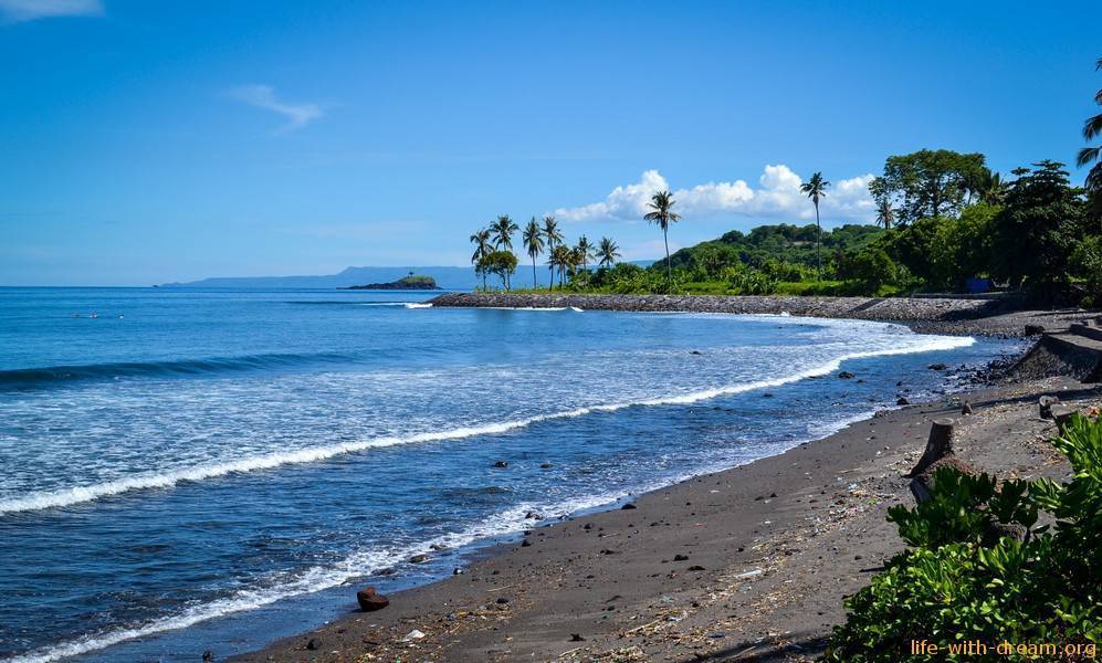 - Пляж с черным песком, океан и храм летучих мышей Goa Lawah.