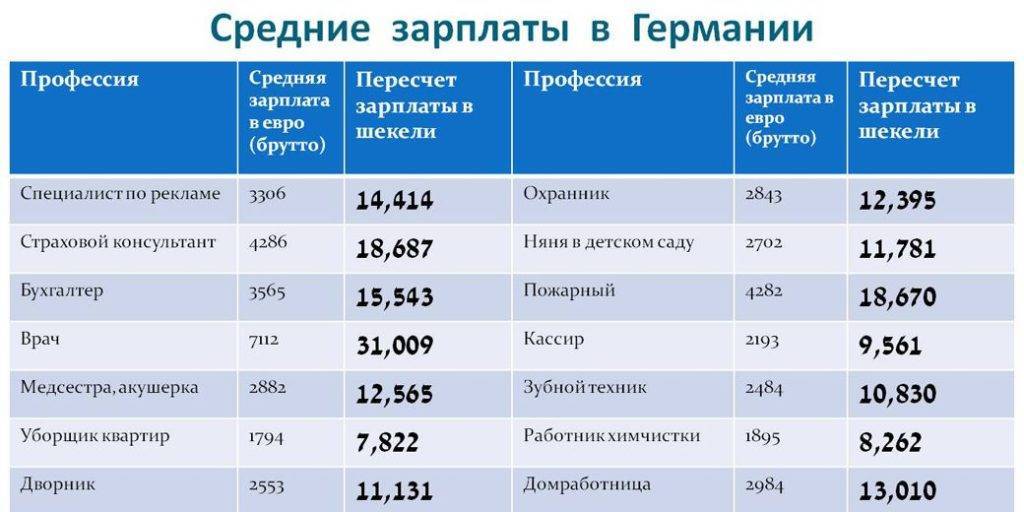 Но «чистыми» деньгами работник получит на руки примерно 60–70% от этой суммы. В общем все сборы и налоги составляют до 41% от брутто. В итоге средняя зарплата в Германии в 2021 году составляет порядка €2400–2500 в месяц.