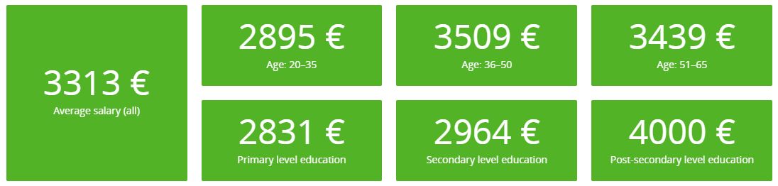 По информации местного Статистического управления официальная средняя зарплата в Финляндии в 2018 году составляет 3418 евро в месяц до уплаты налогов. После вычета налоговых и социальных обязательств в распоряжении работника остается около 2500 евро. При этом женщины получают приблизительно на 17% меньше чем мужчины. В частном секторе финны зарабатывают 3483 евро, в государственных учреждениях на центральном уровне – 3784 евро, а на местном – 2993 евро.