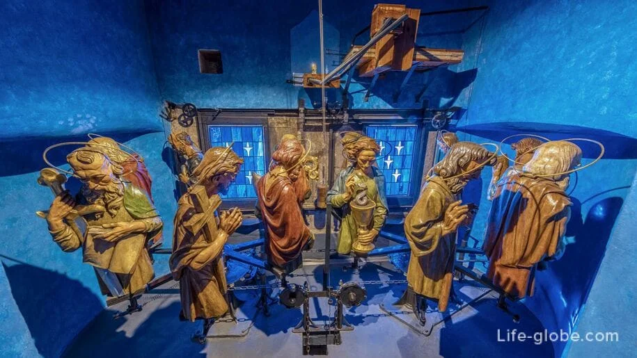 Из готической часовни можно заглянуть внутрь Пражских курантов и проследить за движением часовых механизмов, а также увидеть 12 апостолов «с обратной стороны».