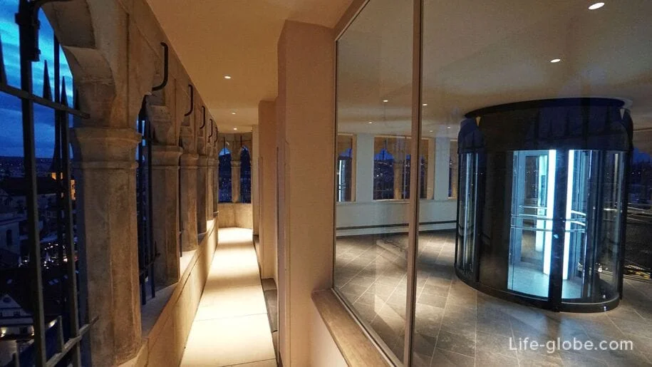 В галерею посетителей доставляет современный стеклянный лифт, или можно подняться по лестнице.
