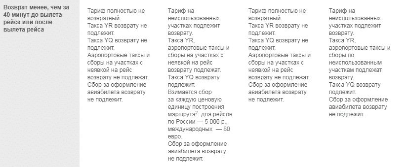 Условия возврата билетов для всех тарифов