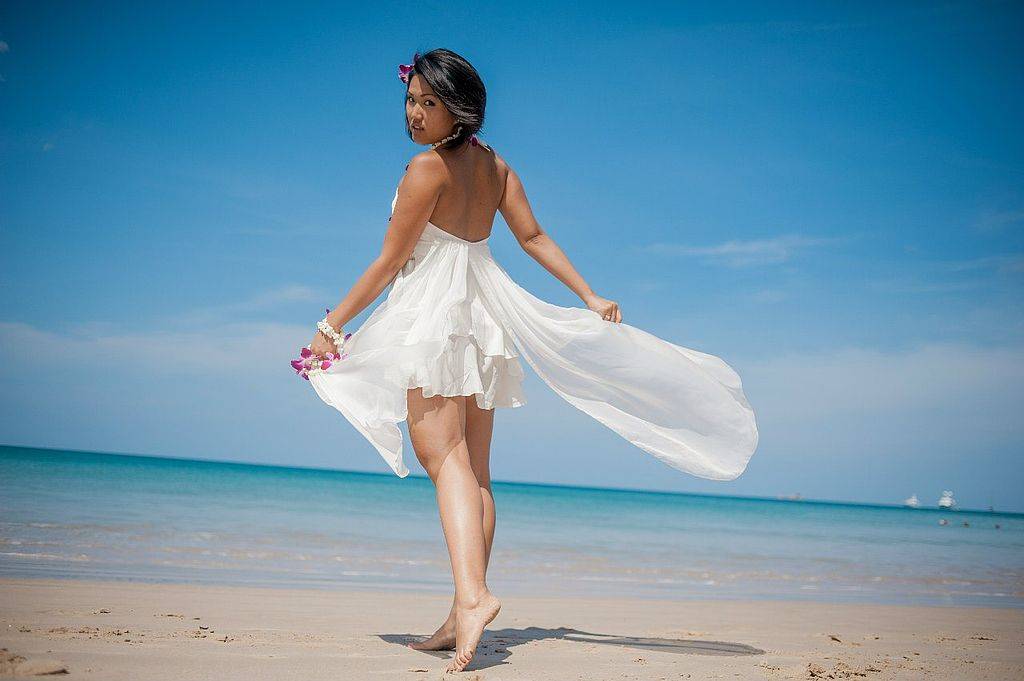 Для пляжной церемонии не забудьте подумать о свадебном платье, в котором вы будете выглядеть ослепительно, но одновременно, вам будет удобно, практично находиться в нем у моря. Для таких ситуаций, существуют специальные одеяния, которые называются «beach casual». Данный стиль свадебного платья подходит для пляжа потому, что имеет менее формальный фасон, без всех этих корсетов, пышных юбок с очень длинным шлейфом. Под такое свадебное платье вовсе не обязательно подбирать обувь – вы будете красиво смотреться босиком, либо в нарядных вьетнамках.