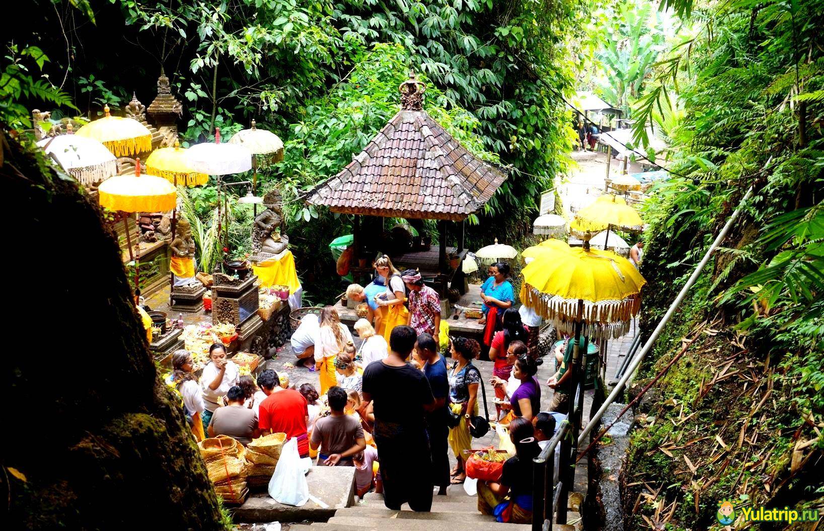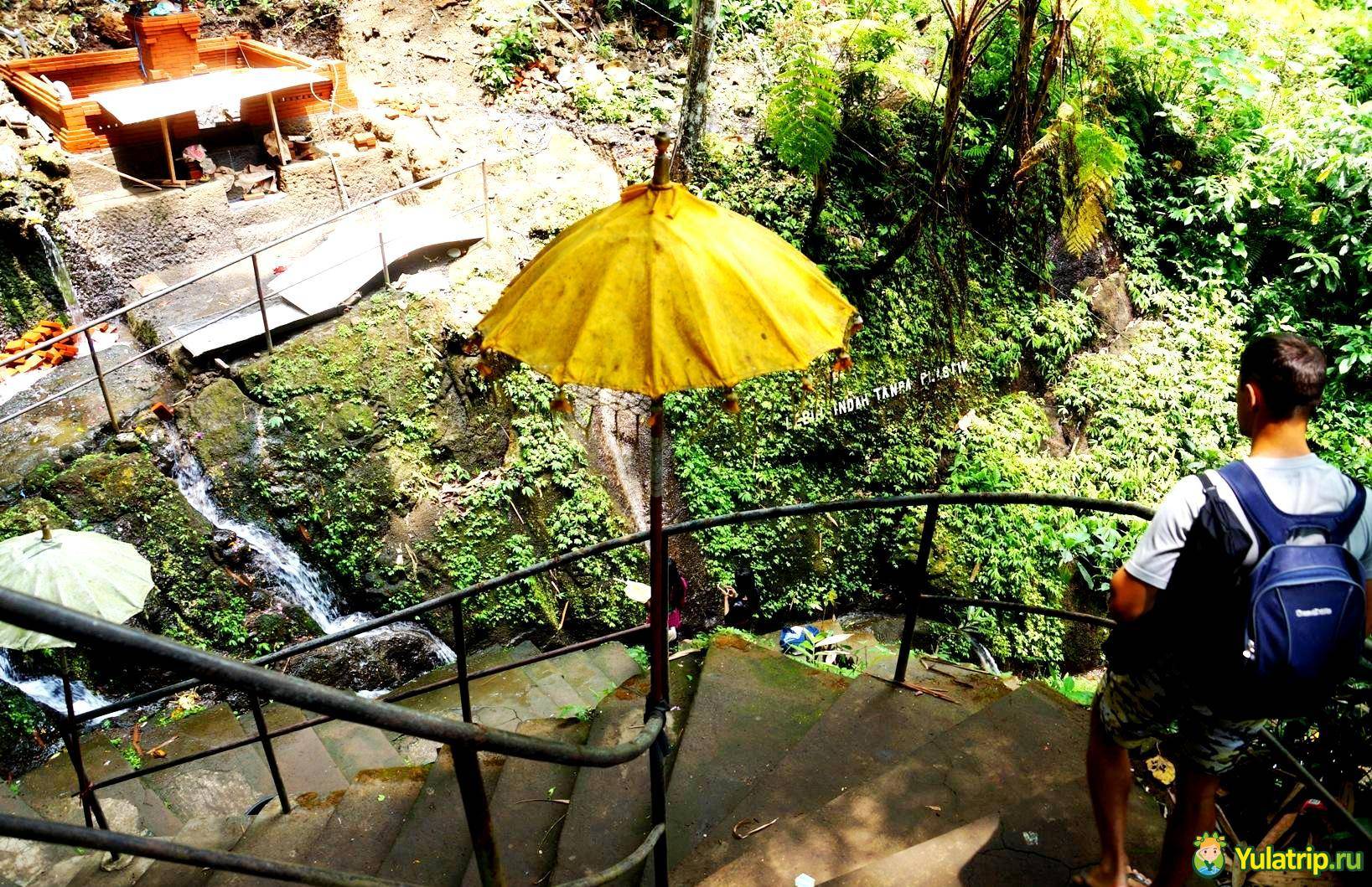 Итак, вы добрались до места, откуда будете спускаться к святым источникам Себату. А дальше вас ждет, как и во многих местах Бали — длинный спуск вниз по ступенькам! Это для нас стало неожиданностью. Погода не радовала — капал мелкий и противный дождик. Но мы все же решили увидеть и искупаться в святых источниках Себату. Местный балиец говорил нам, что местные приезжают сюда целыми семьями и купаются в источниках, и стараются как можно чаще приезжать на источники. Спуск довольно-таки крутой, прямо за нами спускалась целая семья с несколькими маленькими детьми.