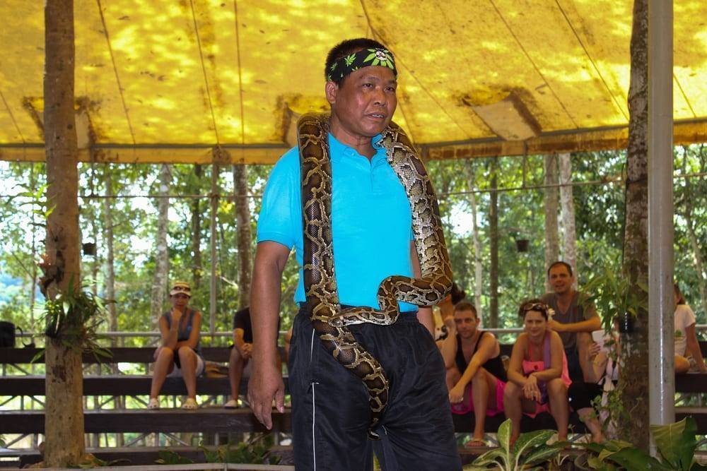 Но гвоздь посещения змеиной фермы для каждого – это змеиное шоу, где ловкий укротитель змей демонстрирует чудеса дрессировки рептилий, а также пугает своими питомцами изумленную толпу.