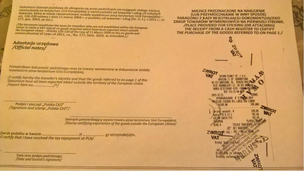 Возможен если магазин выписывает свой документ Tax Free. То есть вы, после вывоза товара, получите от магазина 100% налога на добавленную стоимость (VAT или PTU в Польше), которая указана в документе Tax Free и кассовом чеке. В этом случае вы получите документ, часто на фирменном бланке магазина, где будут указаны ваши паспортные данные, товары которые вы купили, и будет прикреплен кассовый чек. Эти документы могут отличаться по своей структуре и способу заполнения в разных магазинах или торговых сетях. Однако, обязательными должны быть поля, где указаны ваши личные данные, а также место для печатей на границе.