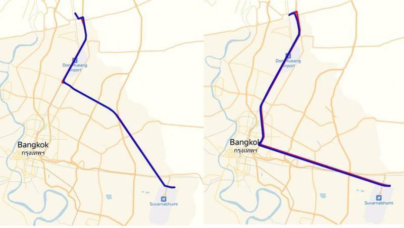 Схемы движения автобусов из Суварнабхуми в сторону Дон Муанг. Справа — 555, слева — 554.