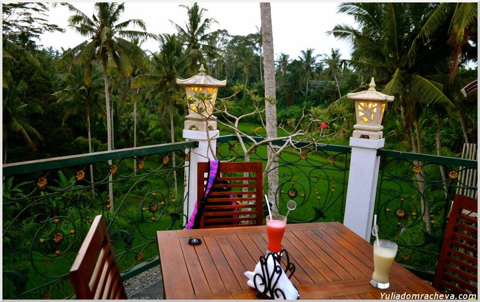 Владелица этого чудесного места женщина на вид 60 лет, родом из Австралии, очень интеллигентная и добродушная, ну а само место просто волшебное! 4 мини виллы, включая хозяйский дом, окружены зеленью рисового поля. Имеется бассейн. В каждой вилле, состоящей из одной просторной комнаты и душевой под открытым небом, есть своя библиотека, с любовью составленная хозяйкой Деви. С утра нас ожидал завтрак из свежих фруктов, купание в бассейне, и очень подробные советы от Деви, куда сходить и что посмотреть из достопримечательностей.
