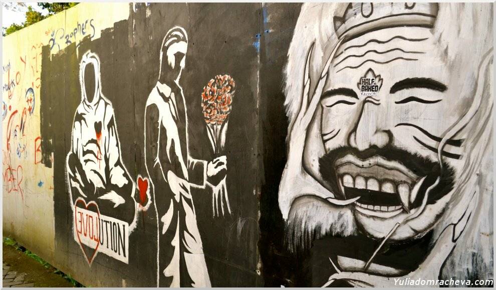 За милой беседой мы и не заметили, как пролетело 2,5 часа, и мы оказались у полуразрушенной расписной стены (подобие Берлинской стены с граффити).