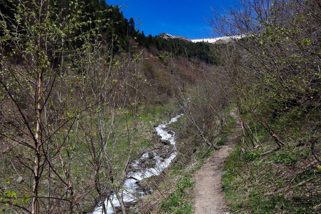 Тропа плавно набирает высоту. Весной по ней протекает небольшой ручеёк, и часть маршрута придётся идти по воде. Вдоль дороги растёт фундук, малина, черника, брусника.