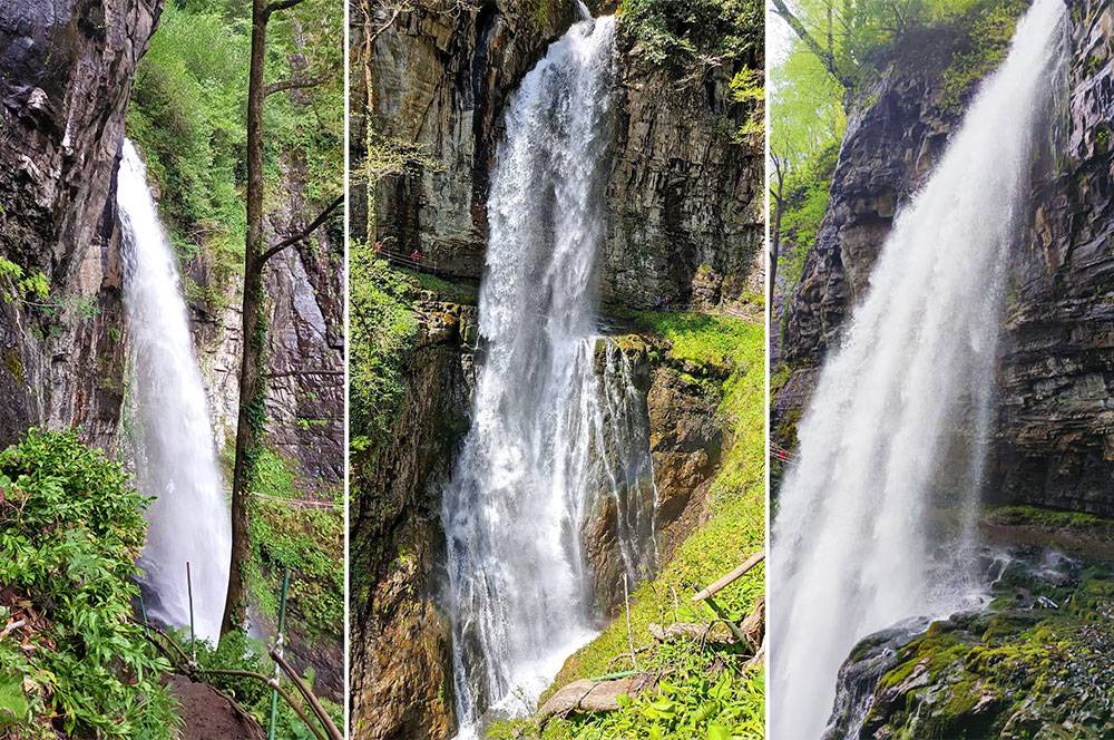 Начать стоит с первого водопада – наиболее зрелищного и огромного. Эксклюзивность упомянутого потока состоит в том, что за его мощной стеной свободно может расположиться человек. Водопад Великан в Абхазии не зря называется именно так: его высота достигает 100 м, а это практически три девятиэтажных дома, поставленных друг на друга! Водопад Великан, что у шахтерского поселка Акармара – самый большой в стране. По этой причине охотников на него посмотреть никогда не убавляется. Почему водопады Акармара не пересыхают, как остальные водоёмы региона? Чуда здесь нет, просто огромный ледник – родитель потока, летом не тает в полной мере, то есть подпитка никогда не прекращается.