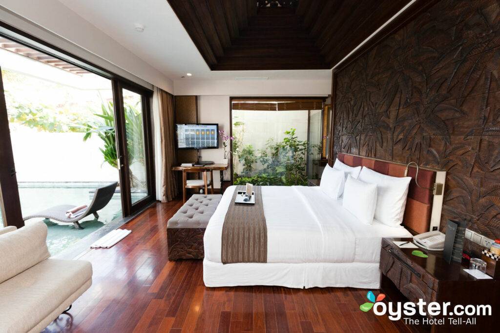 Units are stylish and contemporary, with a subdued earth tone palette, hardwood floors, and floor-to-ceiling windows that open onto small furnished balconies offering views of either the lush grounds or the ocean. Balinese wood carvings, small Indonesian artworks, and the use of stone and wood throughout add local charm, though overall the look is a little bland when compared to other high-end properties in the area.