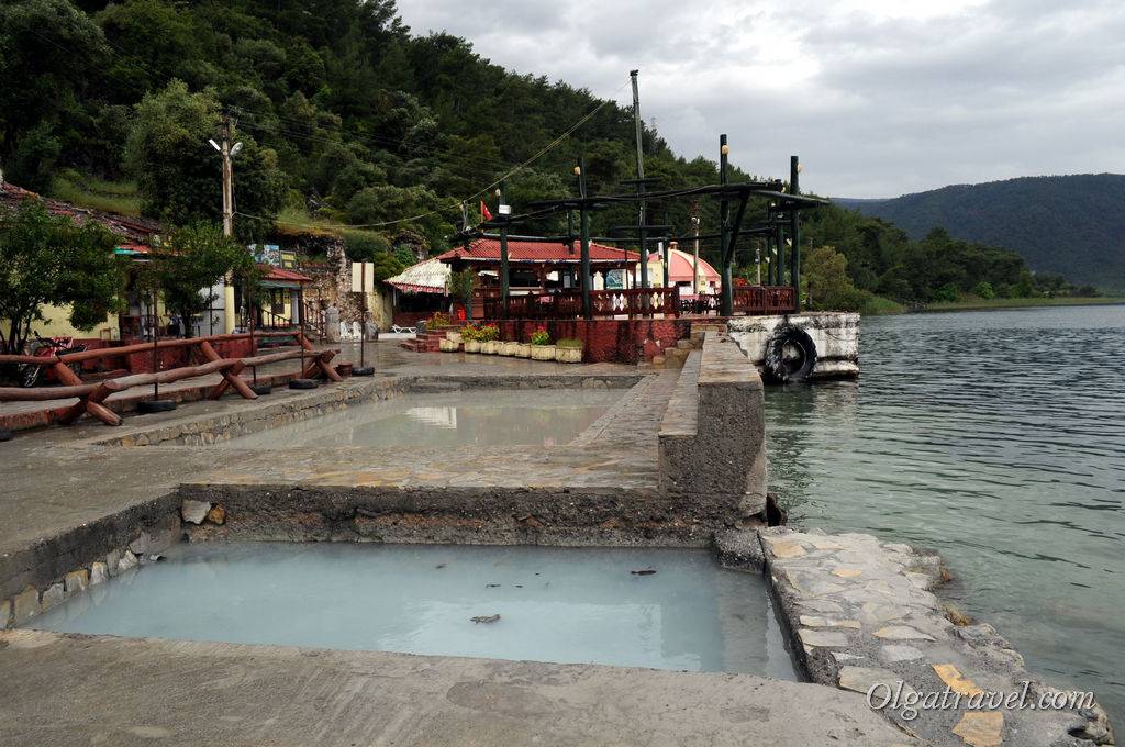 Мы решили все-таки заехать к горячим источникам Султание, несмотря на ужасную погоду и неблизкий путь. Дорога идет сквозь сосновый лес, вдоль озера. Красота там неописуемая! А если ехать в солнечную погоду, так вообще «Вау!». Все же Турции очень красивая страна, жаль, что большинство людей думает, что смотреть за территорией отелей в Турции нечего! И что везде грязь и разруха. Это совершенно не так!