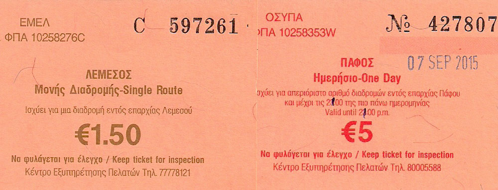 Проезд на транспорте в Пафосе стоит 1,5 евро, но есть и другие тарифы (их вы можете посмотреть в салоне автобуса, рядом с водителем): daily ticket, то есть проездной на весь день, проездные на неделю, месяц и год. Билеты приобретаются при посадке непосредственно у водителя автобуса.