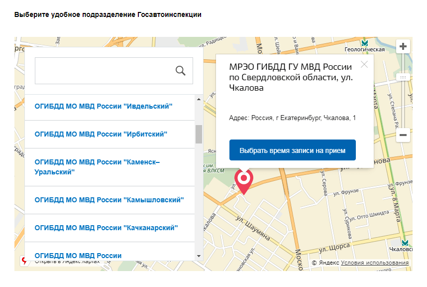 Выбираем удобное подразделение ГИБДД. В Екатеринбурге выбора в общем-то нет, только центральное отделение «на Ясной», которое, оказывается, находится по адресу «Чкалова, 1»