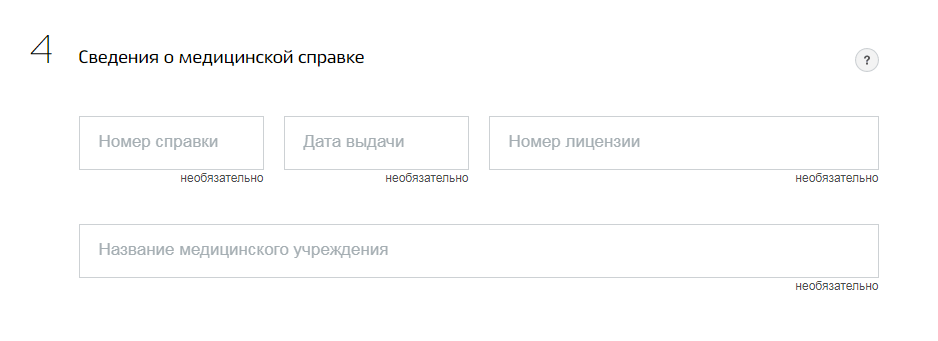 Сведения о медицинской справке можно не вносить, т.к. она не требуется. Оставляем поля не заполненными