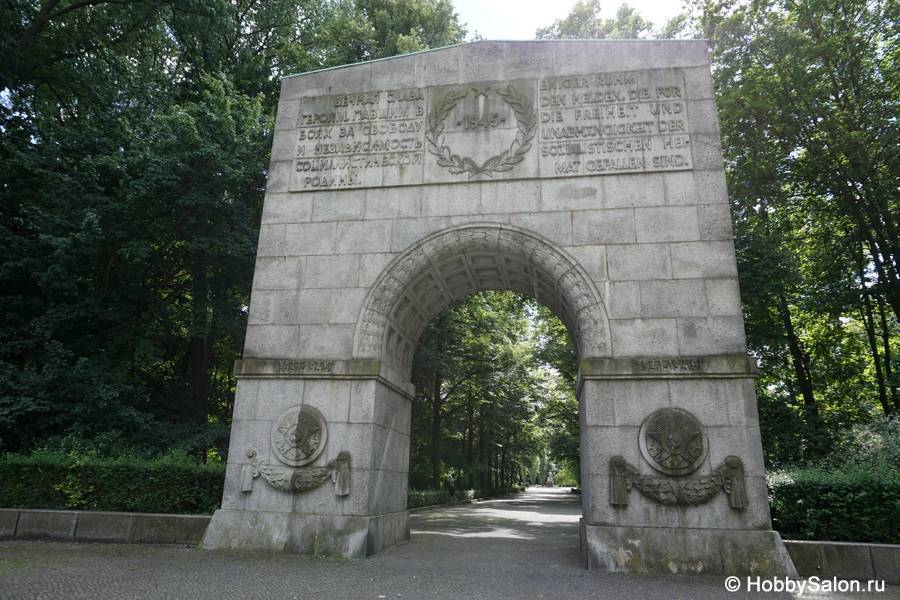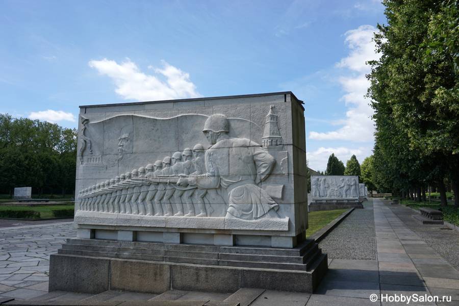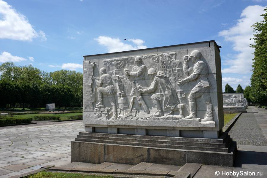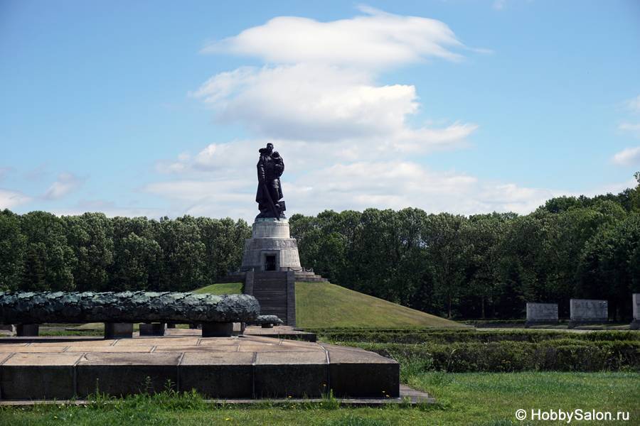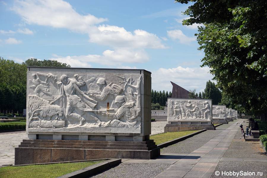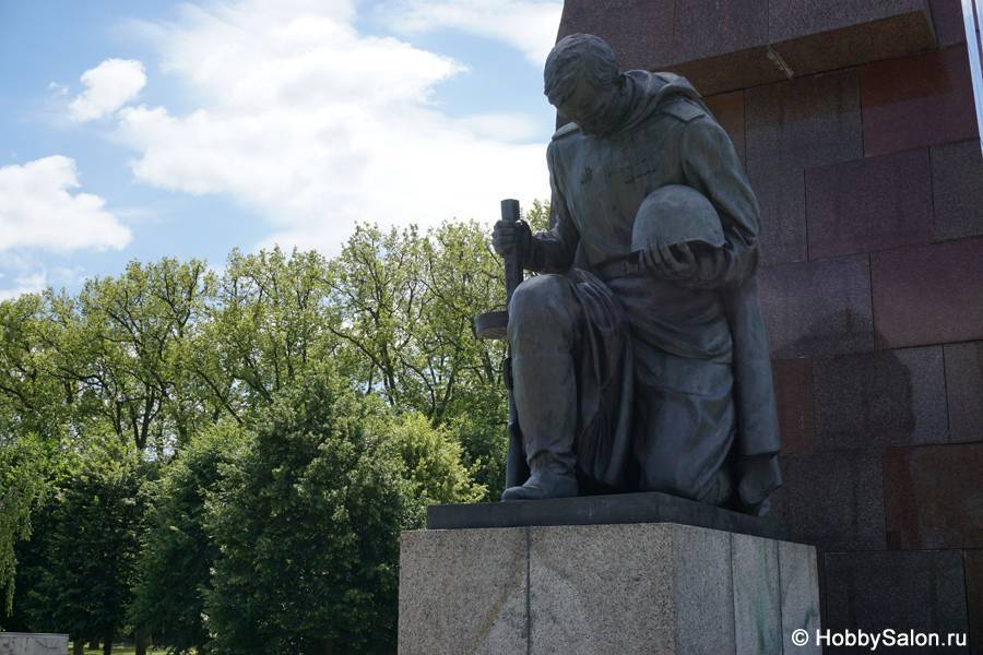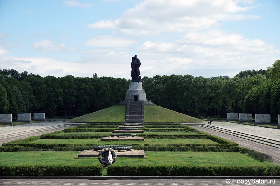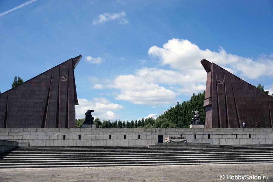 7 тысяч наших солдат захоронены в Трептовом парке. Вечный огонь в чашах, коленопреклонённые солдаты, склонённые знамёна с надписью на двух языках «Вечная слава воинам Советской Армии, отдавшим свою жизнь в борьбе за освобождение человечества».