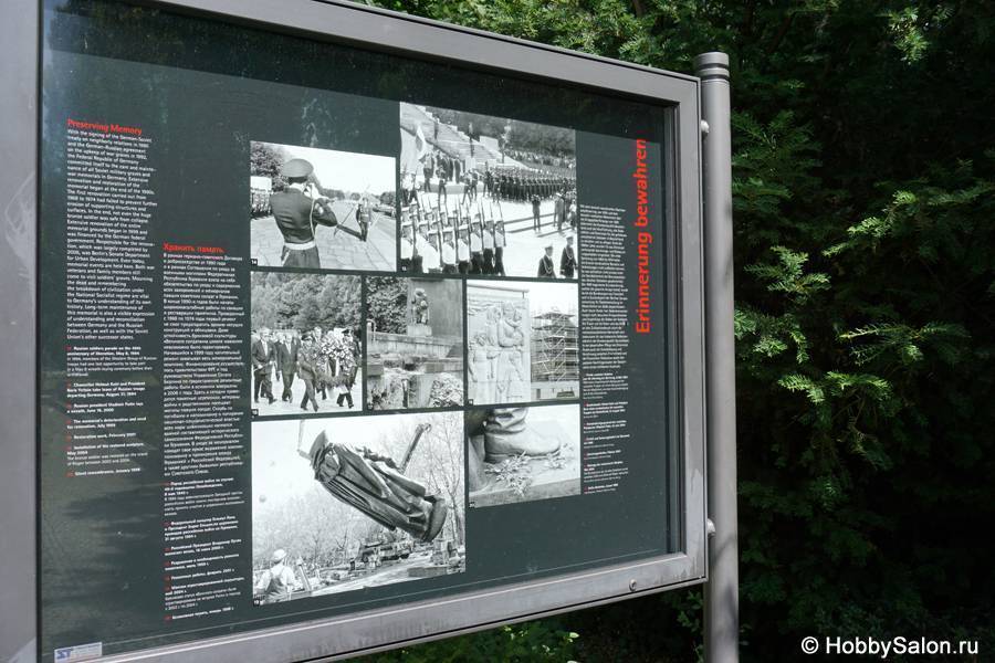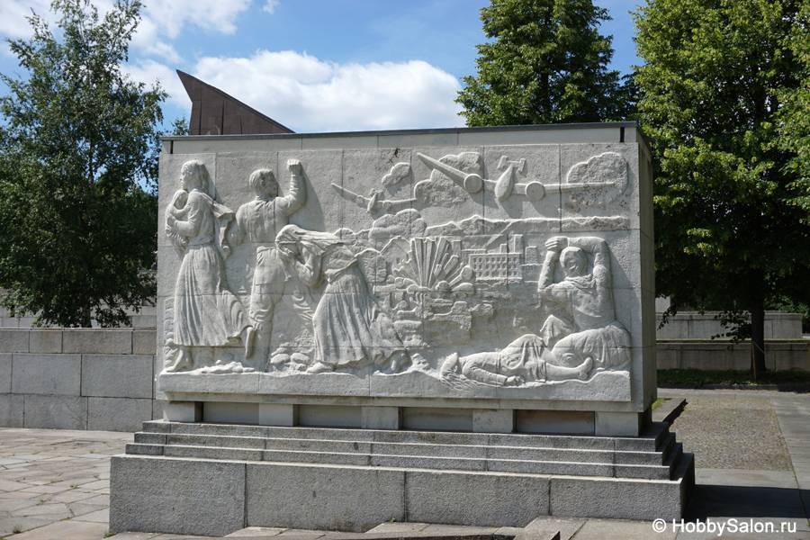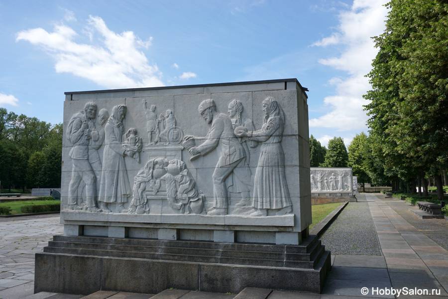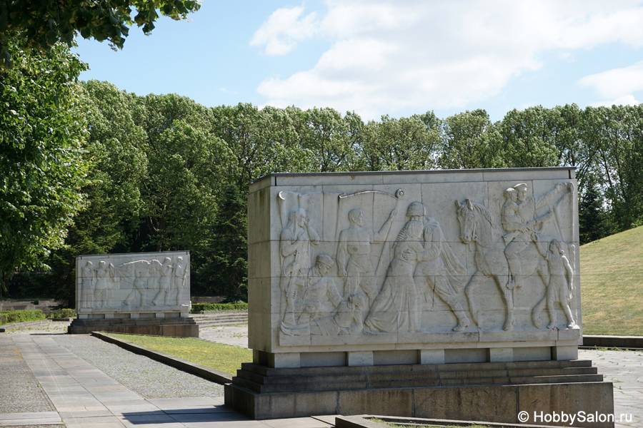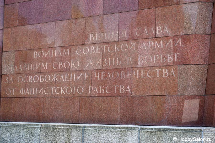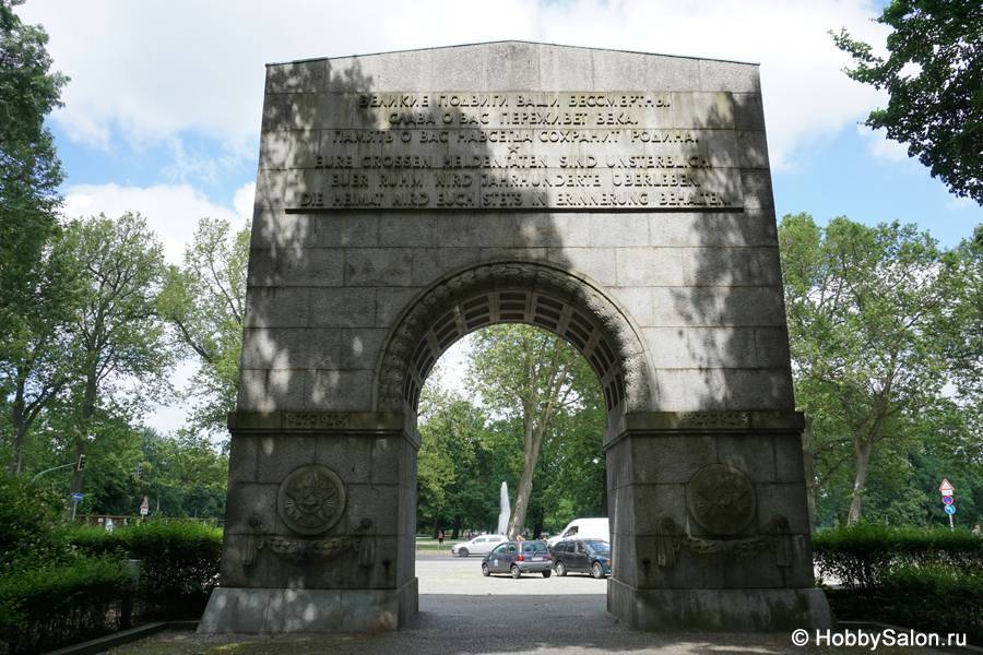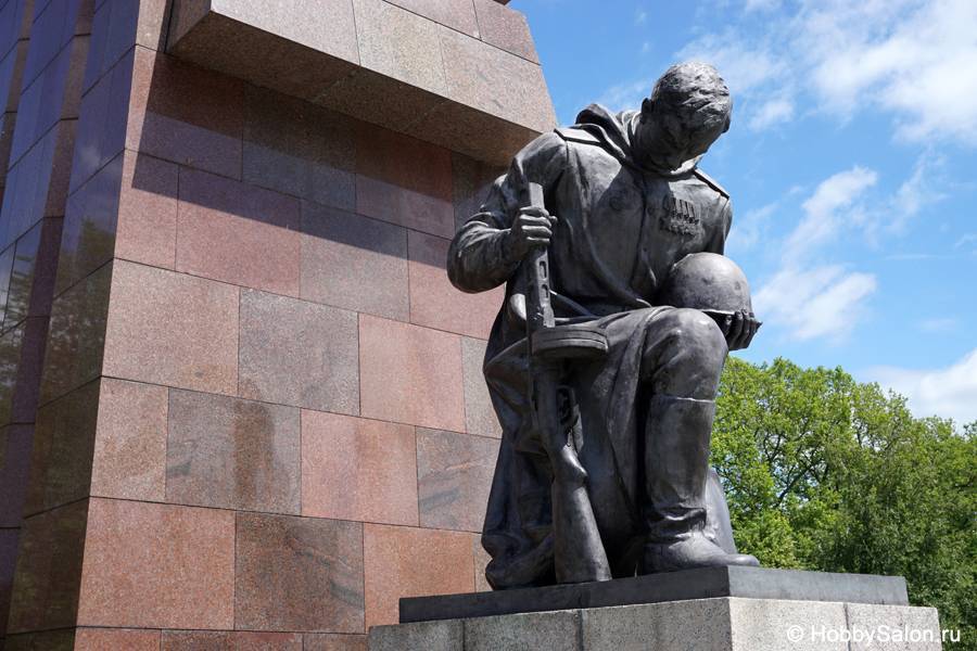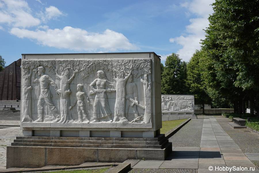 7 тысяч наших солдат захоронены в Трептовом парке. Вечный огонь в чашах, коленопреклонённые солдаты, склонённые знамёна с надписью на двух языках «Вечная слава воинам Советской Армии, отдавшим свою жизнь в борьбе за освобождение человечества».