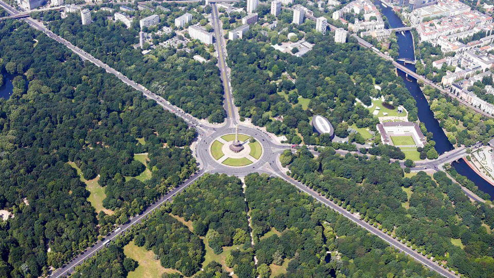 Это памятники, мемориальные комплексы, чайные дома и старинные строения. Интерес представляет аллея скульптур известных личностей Германии и мемориал памяти павшим советским воинам в годы Отечественной войны. В центре парка устремляется ввысь колонна Победы, воздвигнутая в честь проведения триумфальных военных кампаний Пруссии против Франции, Австрии и Дании в XIX веке. Её высота достигает 67 метров. На вершине монумента установлена золочёная статуя богини Виктории, которая держит в руках лавровый венок и жезл.