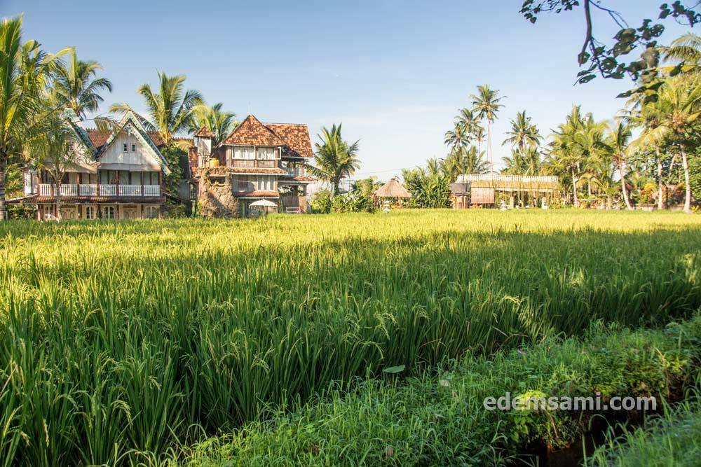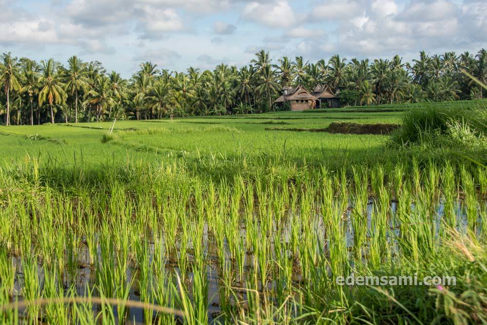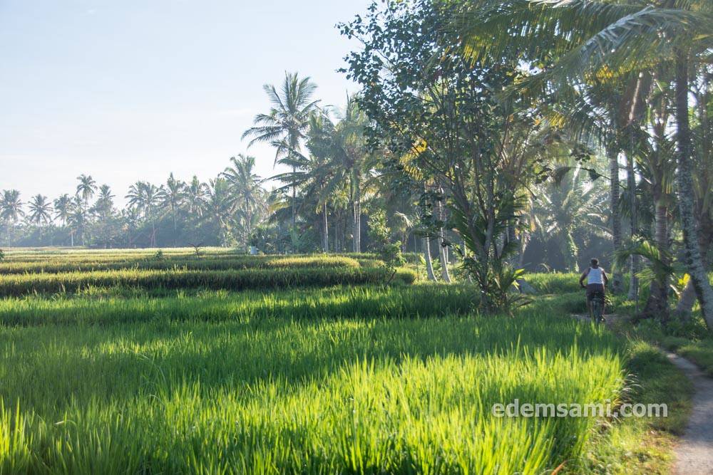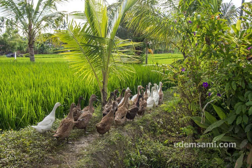 Что вы увидите: много рисовых полей (нетеррасированных), периодически будут встречаться одинокие гесты и резорты, кокосовые пальмы, храмы, кафе, утки. Вот и все, собственно.