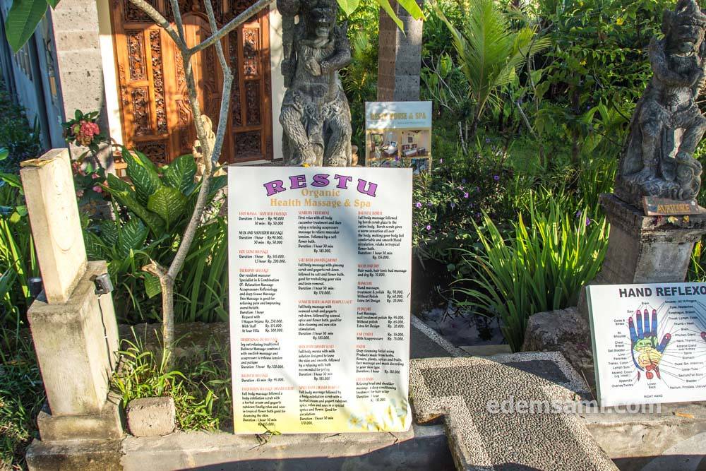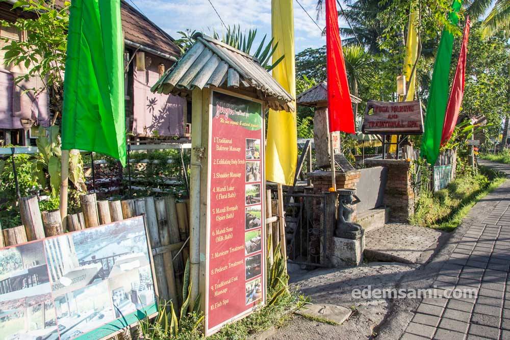 В одно из спа на этой улице мы зарулили вечером. Конечно, и спа, и массажных салонов полно и вдоль главных улиц Убуда, но мне показалось, что тут будет как-то поатмосфернее. В принципе, так оно и есть. Балийский массаж отличается от тайского, так что рекомендую попробовать для общего развития. В конце процедуры для меня налили теплую ванну с местными кореньями и травами. Я осталась в блаженном шоке. Салон в итоге не могу рекомендовать с чистой совестью (он – первый на фото), потому что он, в целом, простой и не выдающийся, но вот несколько фотографий подобных заведений вдоль маршрута: