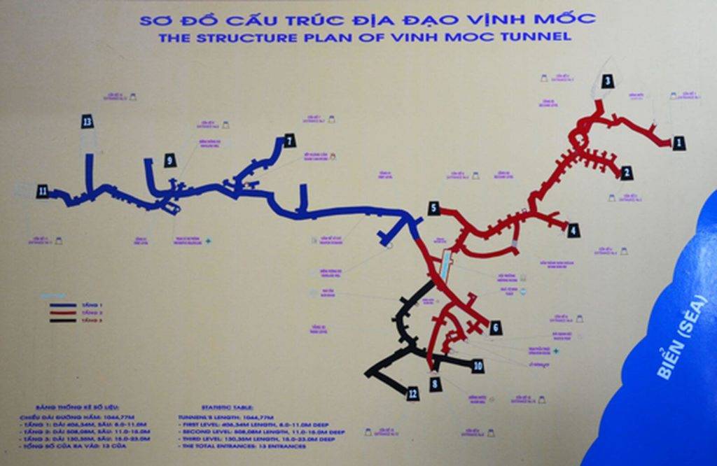The underground part of the hidden system features three deep levels where numerous passages are connected through a central axis and extend to the Saigon River. The first level (3 meters underneath the ground) was capable of withstanding chemical warfare, bullets, tanks, and armored vehicles, whilst the second one (6 meters from the ground) could resist the destructive power of bombs. The third level is the deepest (more than 12 meters from the ground). Between the levels, escape hatches were made to counter toxic gas along with unrevealed vents leading to the ground. Communications passages were constructed 0.8~1.2 meters in size with a minimum 1.5 meter-thick roof.