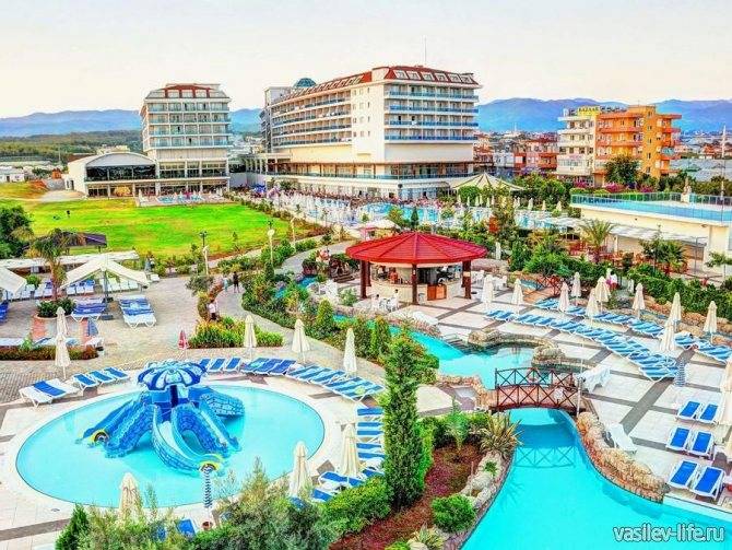 В районе Алании это один из лучших отелей с собственным пляжем, разнообразием спортивных площадок, фитнес-центром и массой дополнительных услуг. На территории собственный аквапарк, клуб детского досуга, игровая площадка и так далее. Доступные цены и качественное обслуживание.