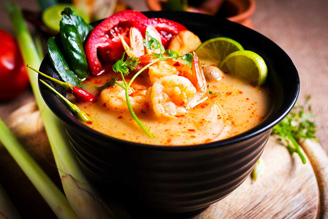Визитные карточки тайской кухни: супы Том-ям (кисло-острый суп на курином бульоне с креветками и морепродуктами), Том Кха Кай и Том Кха Кунг на кокосовом молоке; Пхат Тхай (жареная рисовая лапша с рыбным соусом, сахаром, соком лайма, тамариндом, арахисом и яйцами, может подаваться с различными видами мяса или сыром тофу) и Кхау Кхлук Капи (жареный рис с креветочной пастой, свининой и овощами).