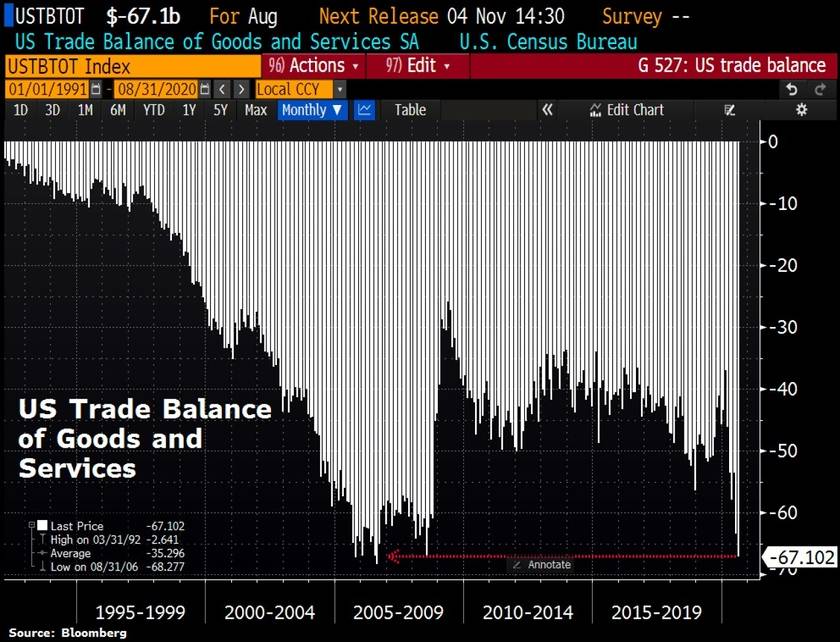 Торговый дефицит США увеличился в августе 2020 г до рекорда с 2006 года, а общий торговый разрыв в товарах и услугах увеличился до $67,1 млрд с $63,4 млрд в июле. Общий объем импорта увеличился на 3,2% до $239 млрд, а экспорт вырос на 2,2% до $171,9 млрд.
