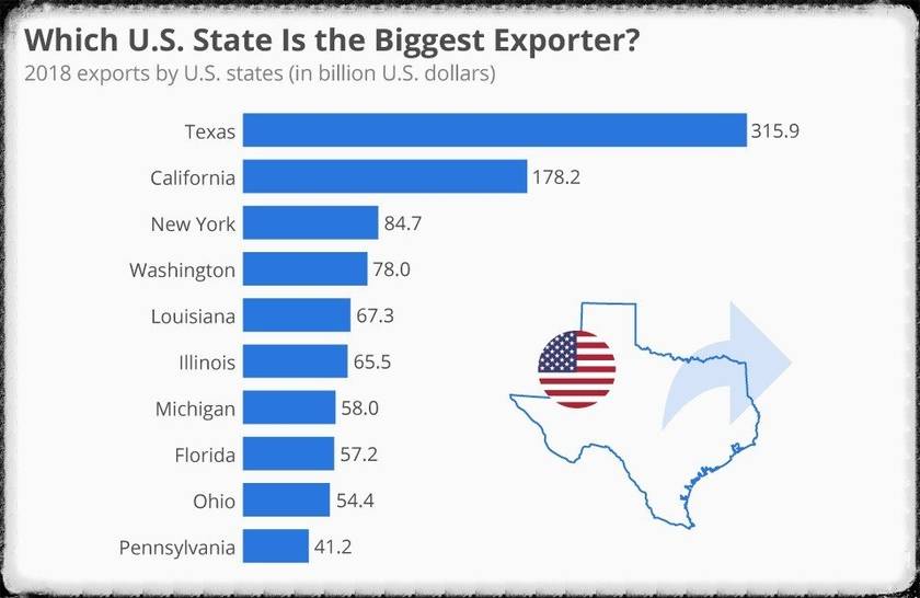 Техас является крупнейшим экспортером среди штатов США по итогам 2018 г. Самым крупным экспортным товаром Техаса были нефть и нефтепродукты, которые составляли 33 процента экспорта Техаса. Другими товарами, отправленными за границу из штата, были компьютерные комплектующие, детали самолетов и интегральные схемы. Хлопок все еще составлял один процент экспорта Техаса.
