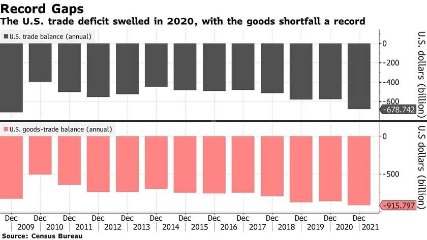 В 2020 году в США был зафиксирован самый большой ежегодный дефицит торгового баланса с 2008 года.