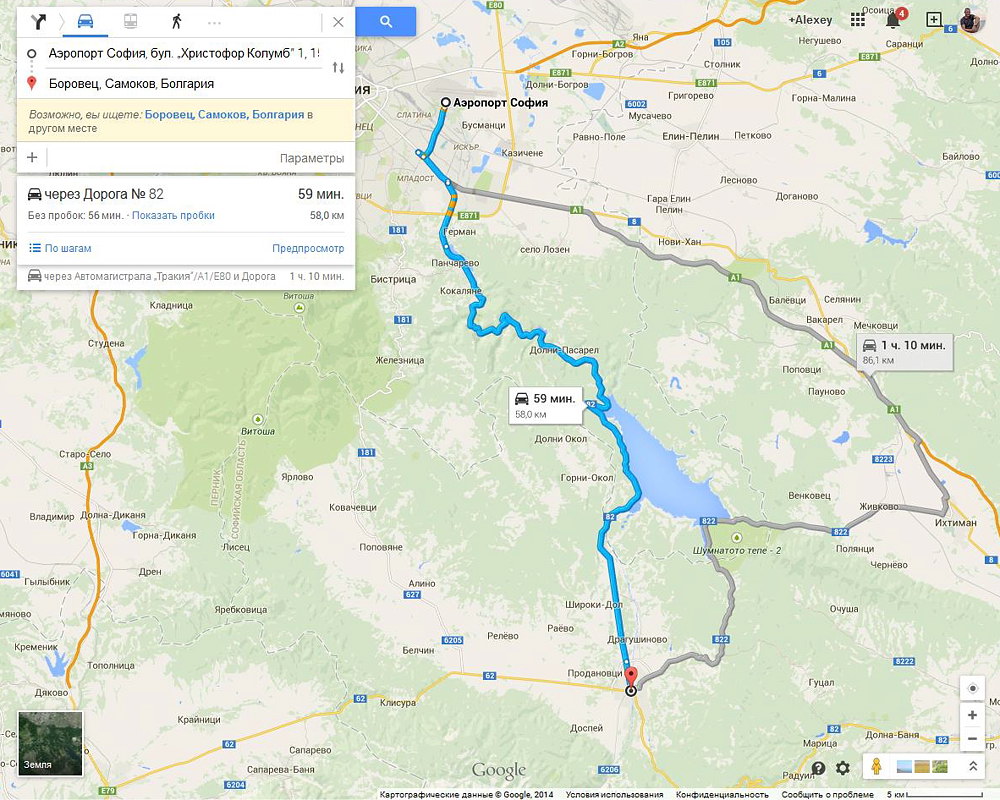 От аэропорта Софии до курорта Боровец расстояние 60 км., это 1 час 20 минут езды по дороге №82.