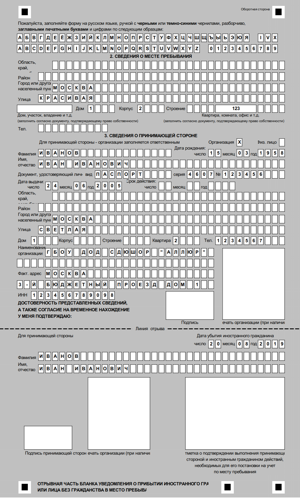 Бланк уведомления о прибытии иностранного гражданина в место пребывания заполняется с двух сторон.