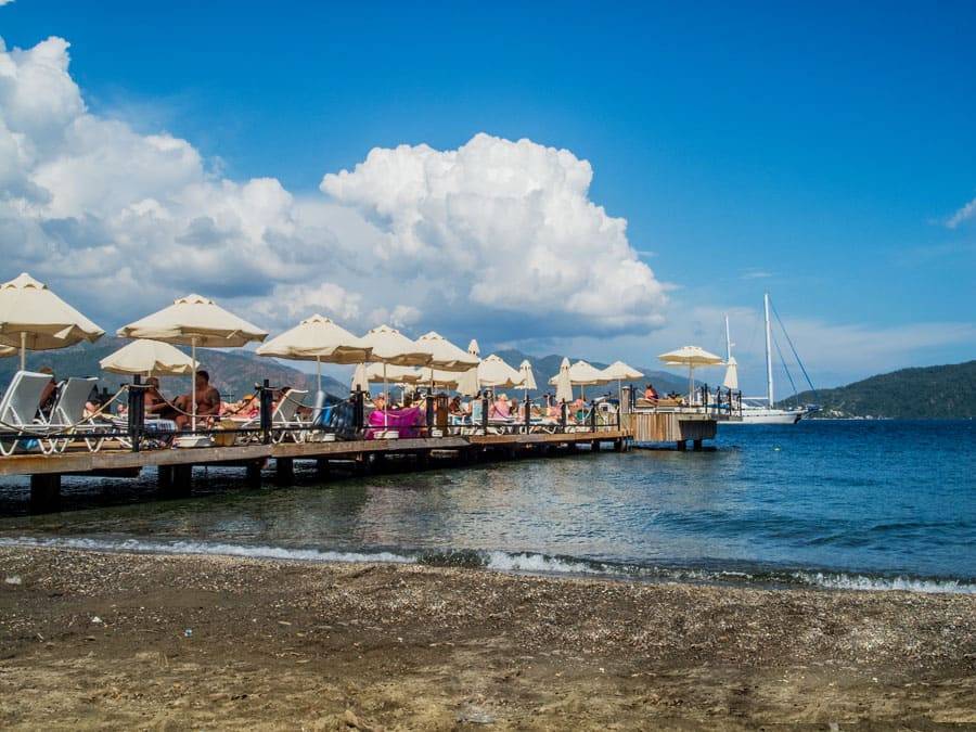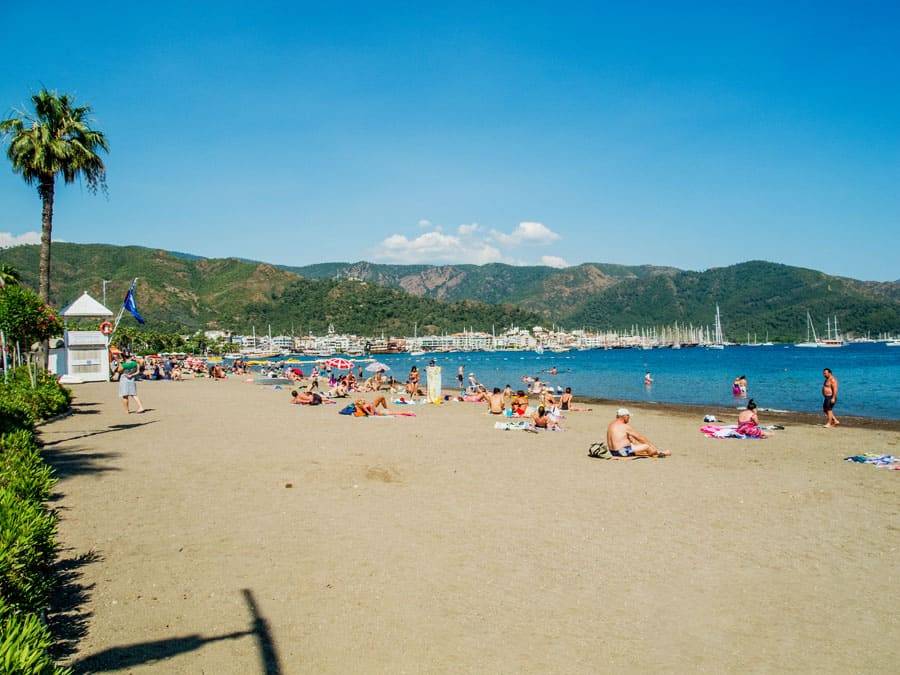 В центре Мармариса пляжи песчано-галечные, берег узкий, а на входе в воду есть галька (рекомендуется надевать специальную обувь для плавания).