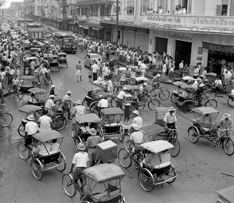 Если вам кажется, что сейчас в Бангкоке ужасный трафик, давайте взглянем, как было раньше. До того, как в столице появились тук-туки и мото-такси, королём дорог был велорикша или по-тайски “самло”. Повозки с прикреплённым велосипедом перевозили пассажиров на небольшие расстояния и пробирались в самые узкие переулки. С увеличением количества машин медлительные велорикши стали создавать заторы и аварийные ситуации. В начале 1960-х они были запрещены в Бангкоке, хотя и остались в некоторых других провинциях.
