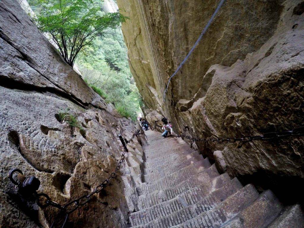 Единственный способ добраться до нее — это опасный спуск по обрыву, со старыми опорами для ног, вырезанными в камне. В скалу вбиты металлические цепи, на которые можно опереться. Чтобы пройти по этой тропе, придется арендовать страховку за 30 юаней.