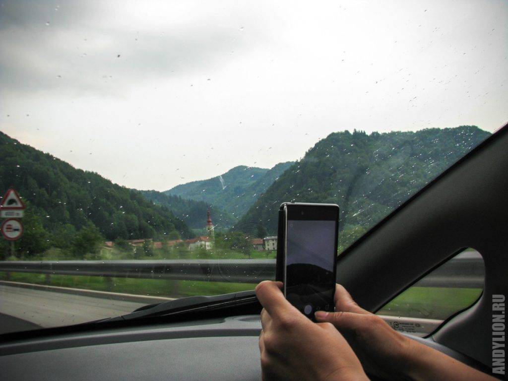 Как-то не сложилось нам поснимать на фото словенскую часть пути, а ведь оно того стоило (хорошо, что все есть на видео). В какой-то момент начал накрапывать дождик, засверкали молнии, а мы стали приблизительно приближаться к пугающей черной облачности. Вскоре, мы настигли грозовой фронт, который вылил на нас несколько тонн воды. Признаться, давно мы не видели дождя такой интенсивности и силы. В какой-то момент видимость снизилась почти до нуля, а обогнавшую нас по левой полосе машину, спустя буквально несколько минут мы увидели уже застывшей поперек дороги — ее крутануло. В целом, было и здорово, и одновременно страшновато, но, слава Богу, с нами ничего плохого не случилось.