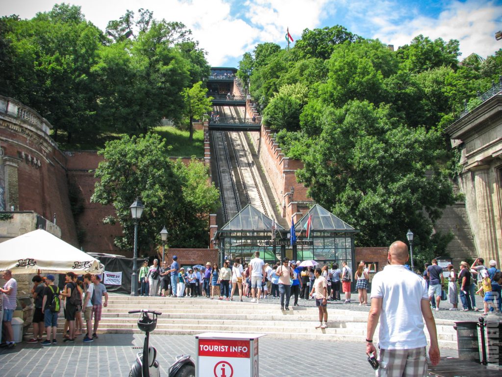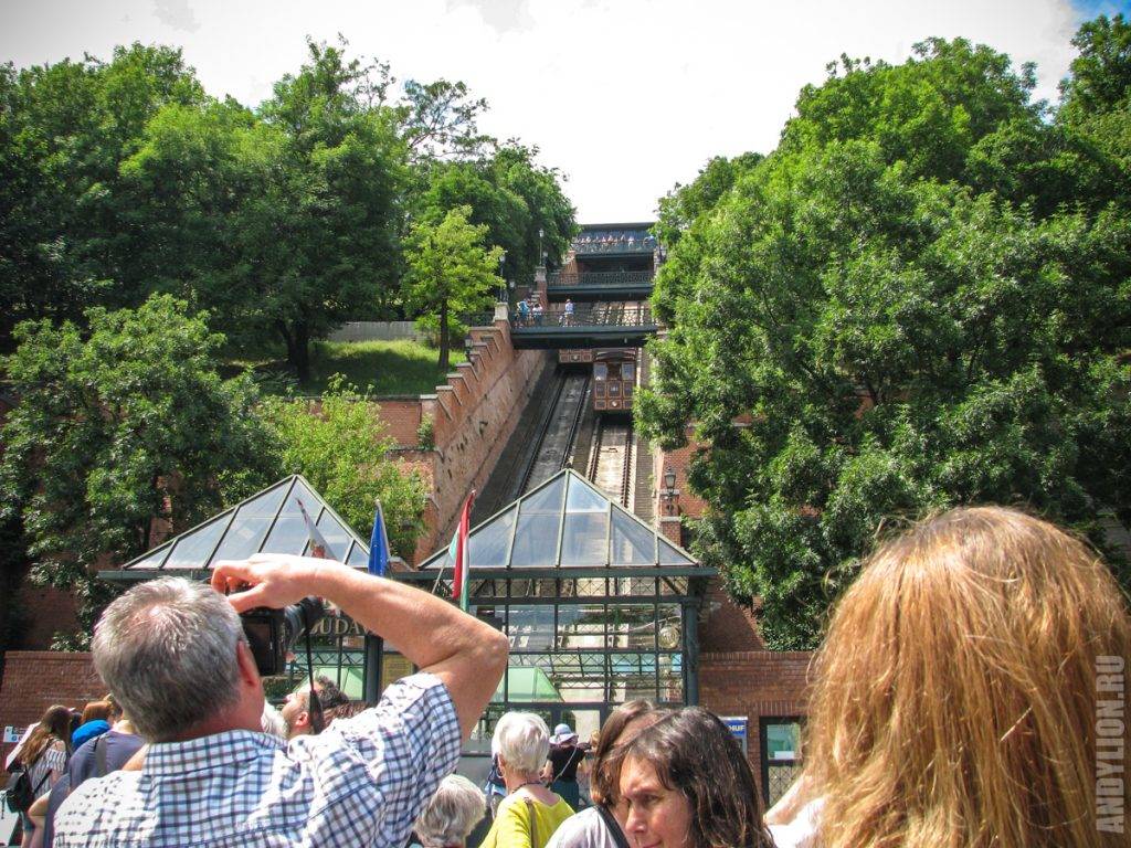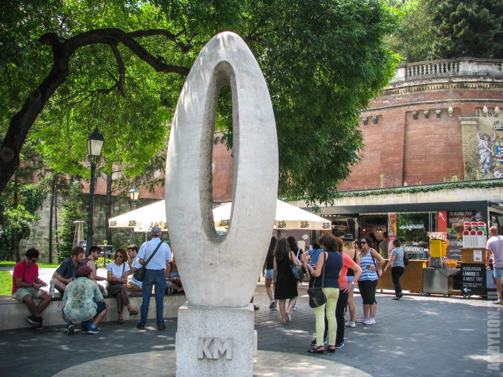 Ну, а мы сошли на остановке у фуникулера, на котором планировали подняться на Замковую гору к Будайской крепости. Сейчас здесь располагается начальная точка отсчета расстояний всех автомобильных дорог Венгрии — нулевой километр. Современная каменная скульптура была установлена в 1975 году.
