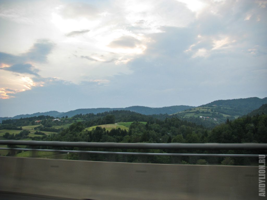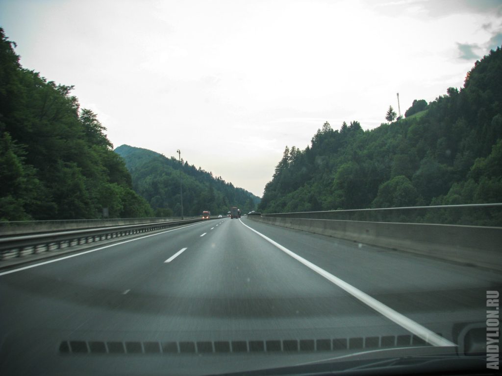 Остаток пути мы ехали между альпийских предгорий. Автобан в Словении оказался просто идеального качества, еще лучше, чем в Венгрии.
