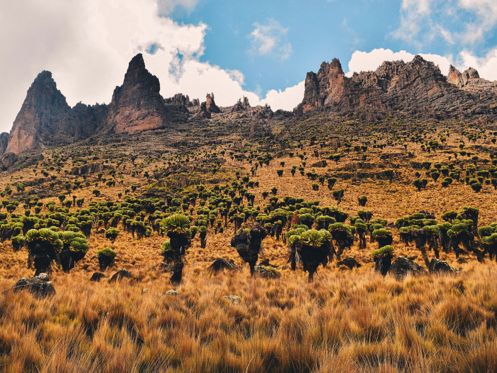 Удивительные скальные образования на Пути Сиримона, гора Кения. Национальный парк Гора Кения открылся для посетителей в 1949 году. На территории парка расположено множество озер, ледников и природных минеральных источников. На горе Кения есть 4 основных пеших маршрута, среди них –  Путь Сиримон (Sirimon Route, север) и Кольцевая тропа. Треки начинаются на уровне 2-3 тыс. м и позволяют увидеть пейзажи джунглей, альпийских лугов, а также тундру, камни и льды.