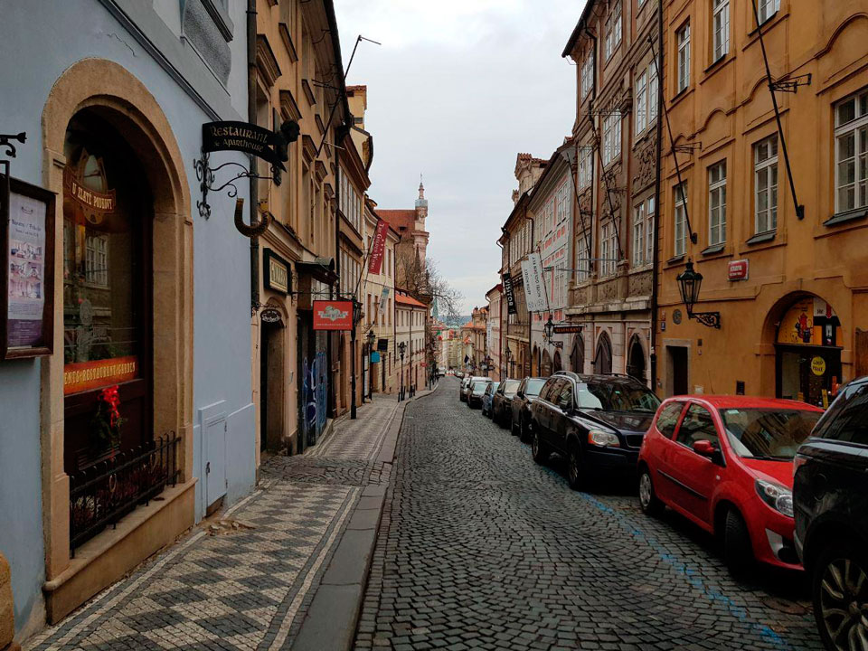 Тоже интересный объект, настоящий раритет среди улиц Праги, по которой в средние века пролегала Королевская дорога. Здесь на старинных особняках вместо номера прикреплён герб владельца. Эта пешеходная зона, где находятся посольства Румынии и Италии, где есть возможность увидеть подлинный колорит средневекового города: барочные и ренессансные фасады, готические подвалы, затейливые дверные ручки, живописные арки, двери с витиеватыми узорами.