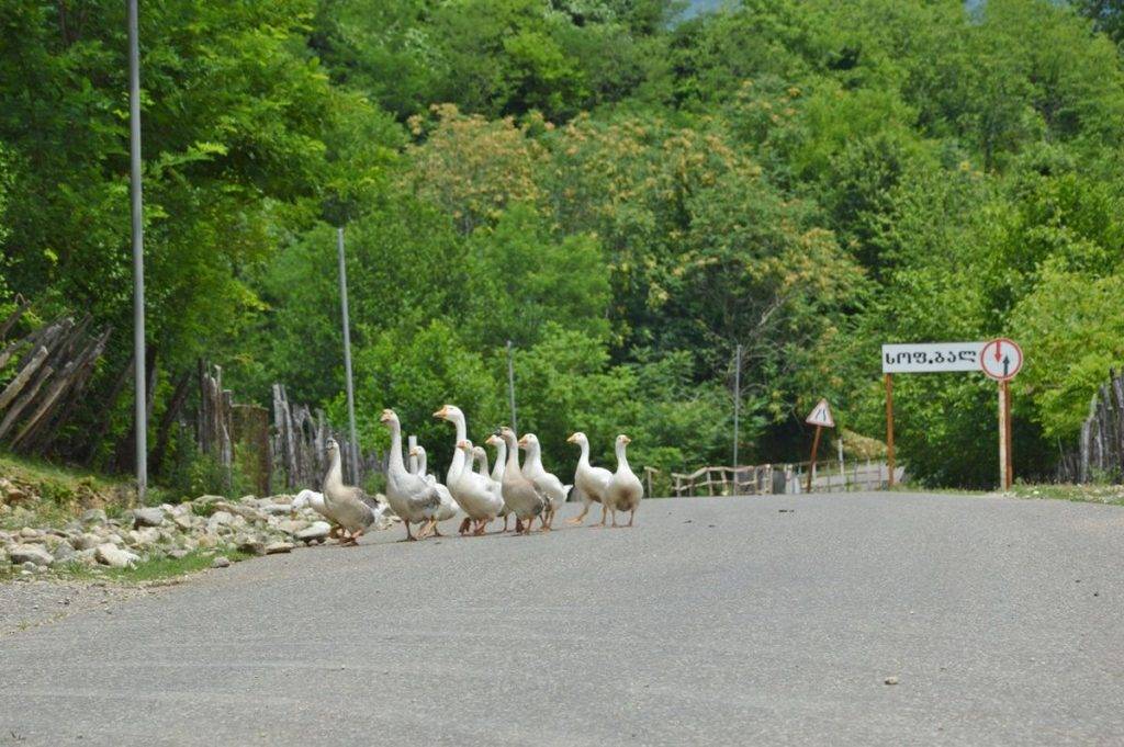 Первым делом доехали автостопом до села Гачедили. Оно находится на повороте на Пирвели Балда, чуть дальше входа в Мартвильский каньон. Оттуда пришлось идти пешком 4 км. Трафика там нет, только две машины проехали мимо.