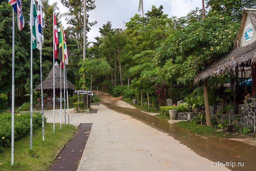 На развилке вам нужна дорога уходящая левее вниз. Там через 20 метров в деревьях начинается тропинка вдоль русла реки к водопаду наверх. Но на развилке можно пойти и правее через ресторан Samui Tropical Garden, тогда путь попроще, с меньшим количеством джунглей и вы почти сразу выйдете к водопаду Намуанг 2.