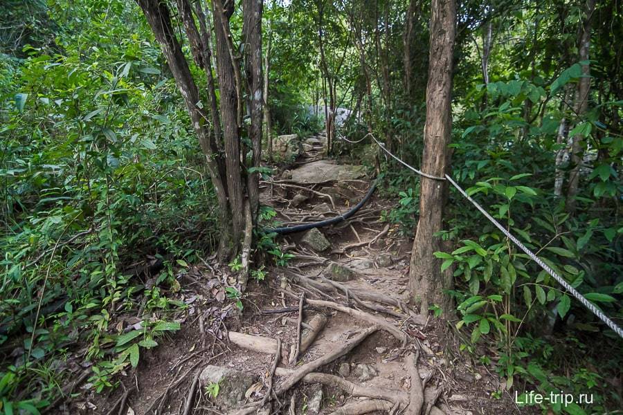 Дальше, на парковке нужно оставить транспорт и двигаться к водопаду пешком по тропе через джунгли. Местами тропа идет по корням деревьев и попадаются камни, поэтому нужно внимательно смотреть под ноги.